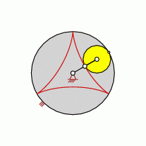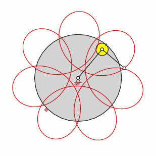 Hypotrochoids are created while a moving wheel (colored in yellow) is scrolling inside a fixed wheel (ring gear)